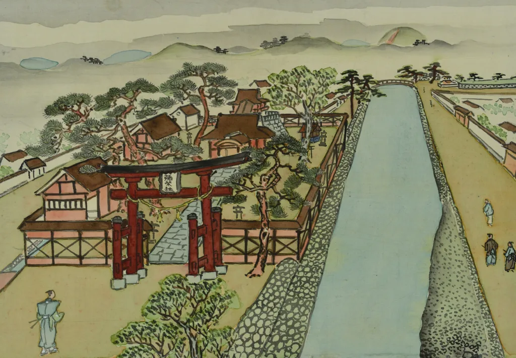 津和野百景図第16図に描かれた弥栄神社の傍らに、松とは異なる力強い一本の樹木が描き込まれています。